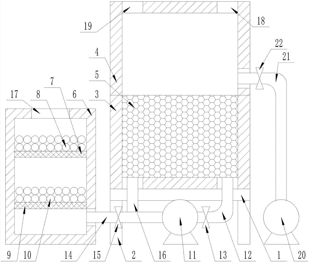 在本實(shí)施方案中,在設(shè)備空閑處設(shè)有HB104控制器,控制器的輸出端與一號電磁閥13、二號電磁閥15、三號電磁閥22、一號引風(fēng)機(jī)11、二號引風(fēng)機(jī)20的輸入端均通過導(dǎo)線相連接,將設(shè)備連接電源,通過控制控制器控制二號電磁閥15、一號引風(fēng)機(jī)11打開,一號電磁閥13、三號電磁閥22、二號引風(fēng)機(jī)20關(guān)閉,從廢氣廢氣進(jìn)氣口17進(jìn)入矩形箱體6,經(jīng)過一號網(wǎng)格擋板7上的脫氮劑8祛除廢氣中的氮,經(jīng)過二號網(wǎng)格擋板9上的脫硫劑10祛除廢氣中的硫;脫硫劑10、脫氮劑8能夠與化肥廠合作提取合成化肥,利用率提高;在一號引風(fēng)機(jī)11的作用下通過二號管道14、三號管道16進(jìn)入U(xiǎn)形槽3,經(jīng)過陶瓷蓄熱體5進(jìn)入到倒U形槽4,倒U形槽4內(nèi)通過燃料入口18加入燃料,通過進(jìn)風(fēng)口19加入氧氣,將廢氣加熱到700-900攝氏度使廢氣中的VOC在氧化分解成二氧化碳和水,氧化產(chǎn)生的高溫氣體流經(jīng)特制的陶瓷蓄熱體5,使陶瓷蓄熱體5升溫而“蓄熱”,此“蓄熱”用于預(yù)熱后續(xù)進(jìn)入的有機(jī)廢氣,從而節(jié)省廢氣升溫的燃料消耗,可以控制三號電磁閥22、二號引風(fēng)機(jī)20的開關(guān)控制廢氣處理時(shí)間,達(dá)到時(shí)間后打開三號電磁閥22、二號引風(fēng)機(jī)20,在二號引風(fēng)機(jī)20的作用下將處理后的廢氣排出;也可以控制一號電磁閥13、一號引風(fēng)機(jī)11打開,二號電磁閥15、三號電磁閥22關(guān)閉,將廢氣循環(huán)引入U(xiǎn)形槽3、倒U形槽4內(nèi),可循環(huán)處理,多次處理后廢氣分解效率達(dá)到99%以上,節(jié)約空間、節(jié)省投資費(fèi)用。